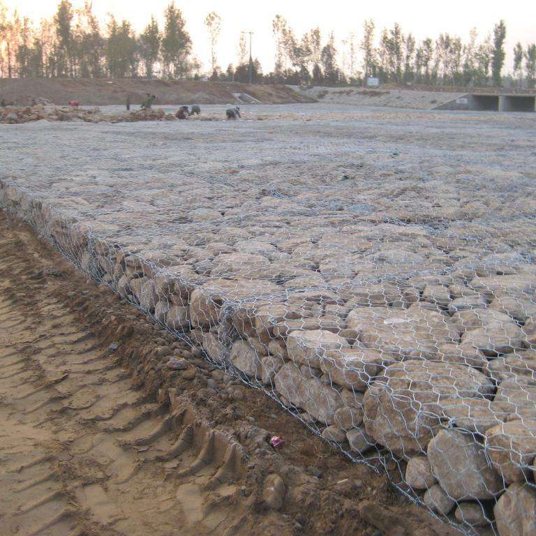 雷諾護(hù)墊是指由機(jī)編雙絞合六邊形金屬網(wǎng)面構(gòu)成的厚度遠(yuǎn)小于長(zhǎng)度和寬度的墊形工程構(gòu)件,其中裝入塊石等填充料后連接成一體,成為主要用于水利堤防、岸坡、海曼等的防 沖刷結(jié)構(gòu),具有柔性、對(duì)地基適應(yīng)性的優(yōu)點(diǎn)。