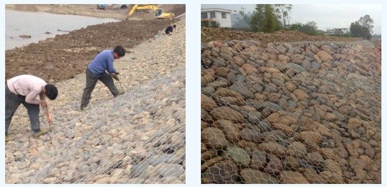 在網(wǎng)籠內(nèi)填塊石時,外露面應(yīng)用粒徑不小于10cm的塊石,并用人工擺砌平整,以獲得美觀的表面及防止水流將塊石從網(wǎng)目中淘走。應(yīng)保證超填石料高2.5~3cm,以便為沉陷留有余地。