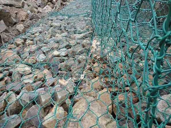 包塑石籠網(wǎng)是使用機器將金屬線材單向搓捻兩周編織的六角形網(wǎng)(六角網(wǎng)) 制成的網(wǎng)箱,厚度在0.15-0.5m(含0.5m),又稱石籠網(wǎng)箱和石籠護墊,石籠網(wǎng)墊由隔板分成若干單元格,為了加強石籠網(wǎng)墊結(jié)構(gòu)的強度,所有的面板邊端均采用直徑更大的鋼絲。
