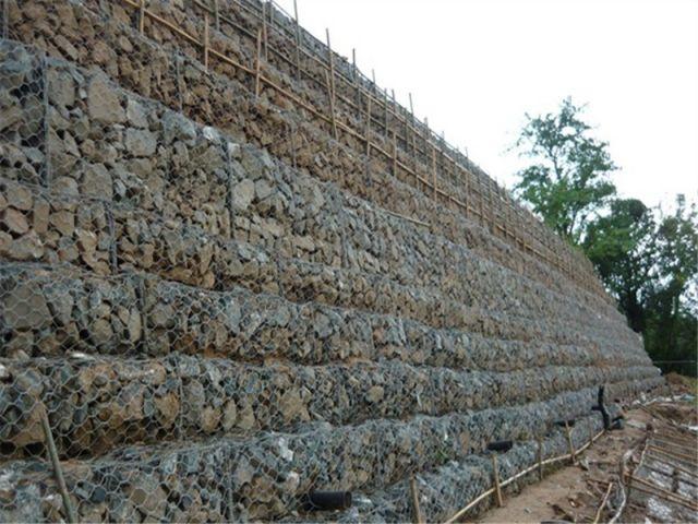 格賓網(wǎng)擋土墻,是格賓網(wǎng)籠子層疊堆砌的擋土建筑物。格賓網(wǎng)箱擋土墻的構(gòu)件是在網(wǎng)箱內(nèi)部填充大小比例相當?shù)氖瘔K,這樣就有一定的孔隙率,由于石塊之間的間隙,可以排出砌體后面的土壤和護坡下面土層的水,這樣就降低了水位,減少墻體后和坡下的地表水壓力,水及時排出降低了擋土墻被破壞的幾率,這樣擋土墻的壽命會大大的延長。同時墻體網(wǎng)箱是鐵絲網(wǎng)制作的籠子,能夠有一定的變形,況且,石塊與石塊之間,也可以滑動,所以擋土墻的變形能力也能夠緩沖突發(fā)的外力。