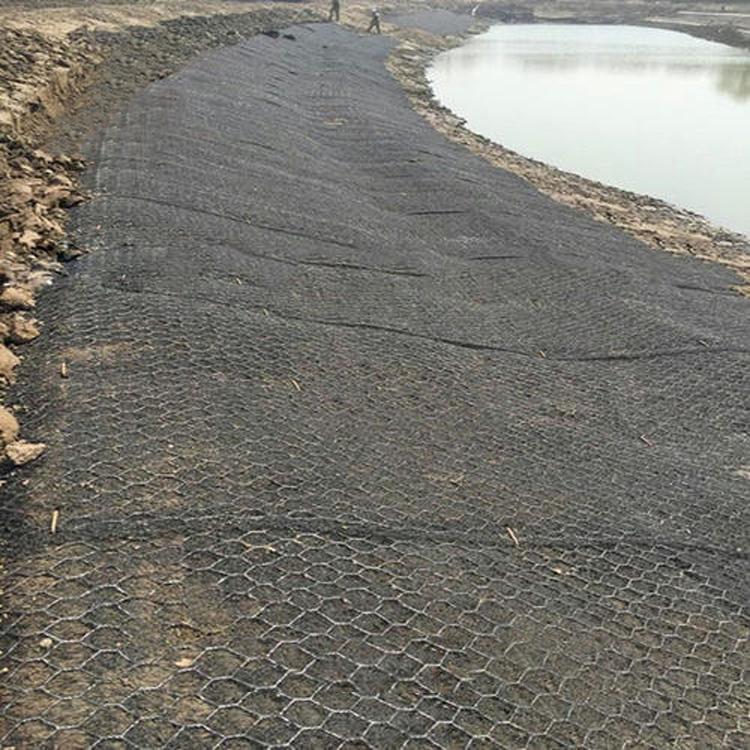 1、加筋三維植物網(wǎng)墊是聚丙烯經(jīng)過(guò)擠成單絲后無(wú)規(guī)則的疊成一定厚度并且通過(guò)熱黏結(jié)成土工網(wǎng)墊,具有開(kāi)敞式的三維空腔結(jié)構(gòu),孔隙率大于90%,同時(shí)通過(guò)專(zhuān)門(mén)的設(shè)備,將各種鍍層(鍍鋅、鍍高爾凡、鍍鋁鋅合金、PVC覆塑)的雙絞合六邊形金屬網(wǎng)復(fù)合到柔性墊中。