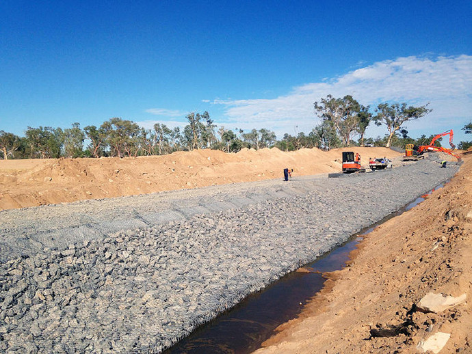 固濱籠是由經(jīng)表面防蝕處理的低碳鋼絲用機械編織的雙絞六角形柔性金屬網(wǎng)制成。將金屬網(wǎng)綁扎成不同結(jié)構(gòu)和尺寸的相互連接的網(wǎng)籠、網(wǎng)墊,填入適當(dāng)?shù)氖瘔K,然后綁扎蓋網(wǎng)形成的石籠、石墊整體護面。固濱籠為剛?cè)?/span>“板塊”。柔中帶剛,透水性好,有利于補充堤外水源。“板塊”可以抵抗坡面外水沖刷,也可排除內(nèi)水。